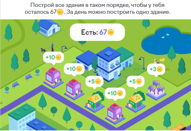 4 задание: Построй все здания в таком порядке, чтобы у тебя осталось 67. За день можно построить одно здание.