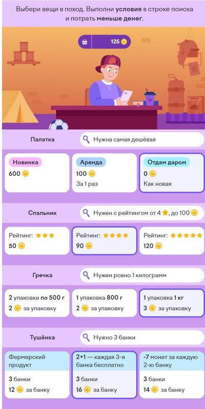 8 задание: Выбери вещи в поход. Выполни условия в строке поиска и потрать меньше денег.