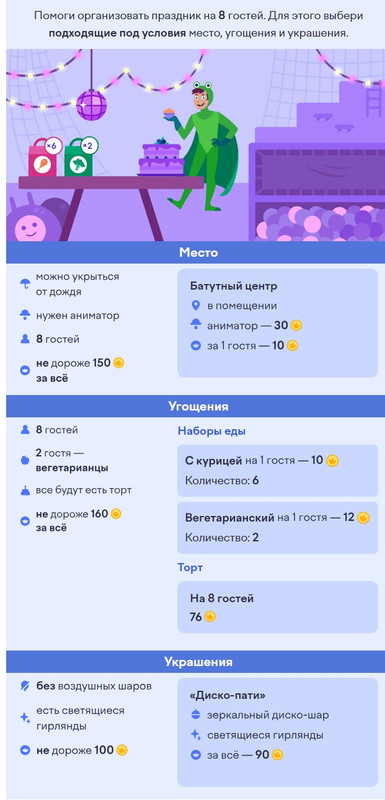 2 задание: Помоги организовать праздник на 8 гостей. Для этого выбери подходящие под условия место, угощения и украшения.