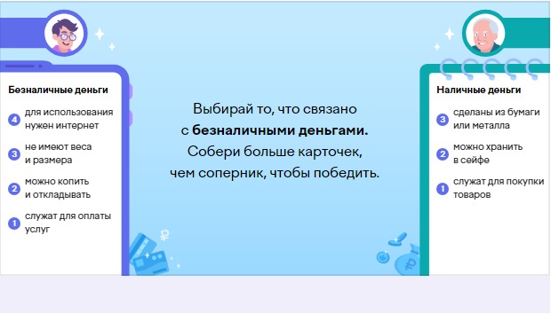 5 задание: Выбирай то, что связано с безналичными деньгами. Собери больше карточек, чем соперник, чтобы победить.