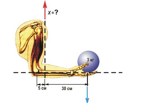 F_мышцы = (3 кгс * 30 см) / 5 см = 18 кгс