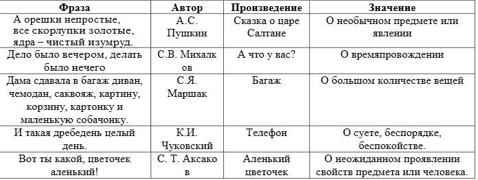 Соотнесите фразу с автором, произведением и её общим смыслом. Составьте собственное высказывание, включив в него часть цитаты в значении, указанном в таблице.
