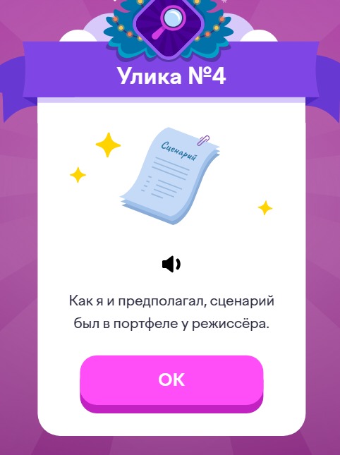 Здесь надо кликать на замочки, чтобы они все открылись, зеленые треугольнички должны смотреть вверх. Портфель открыт, там лежит сценарий. Таким образом, находим четвертую улику.