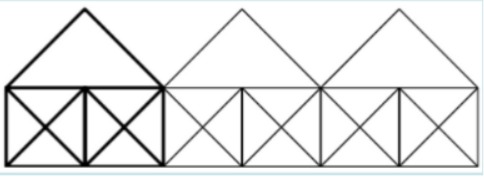 Диана рисует одни и те же домики непрерывным образом − они состоят из двух одинаковых квадратиков и прямоугольного треугольника как крышу. Каждый новый домик она стыкует рядом с предыдущим, вы можете видеть эти три прекрасных домика снизу. Какое минимальное число таких домиков ей нужно нарисовать, чтобы она могла насчитать хотя бы 2025 треугольников в рисунке?