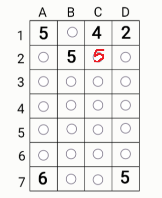 Лёня разрезал по линиям сетки прямоугольник 7 х 4 на семь прямоугольников площадью 6, 5, 5, 5, 4, 2, 1. Площадь каждого из первых шести прямоугольников Лёня написал в одной из его клеток. Какой клетке соответствует прямоугольник площади 1?