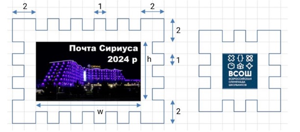 Команда дизайнеров работает над созданием макета почтовой марки с использованием новаторской квадратной перфорации. Подготовленное художником изображение имеет размеры w миллиметров в ширину и h миллиметров в высоту (для удобства дальнейшей работы эти величины выражаются нечётными натуральными числами). Рисунок печатается в типографии с белыми полями шириной 2 миллиметра со всех сторон, после чего осуществляется перфорация, как показано на рисунке.