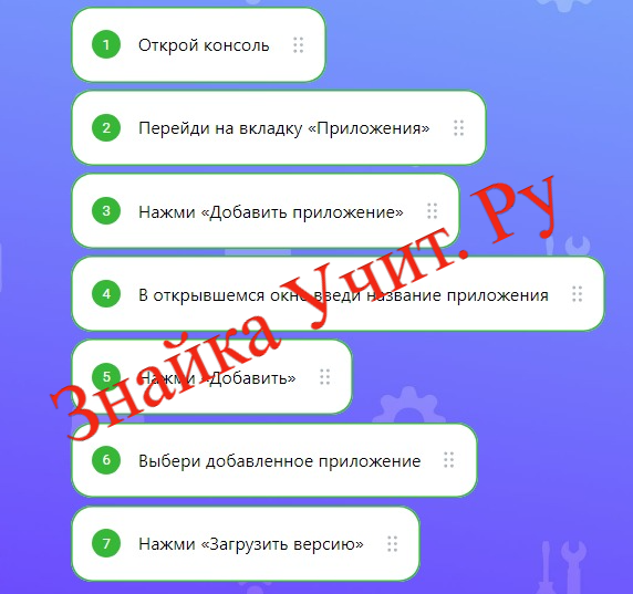8. Ваш помощник пытался опубликовать своё первое приложение в магазине приложений, но запутался в шагах. Помоги ему, восстановив правильный порядок действий.