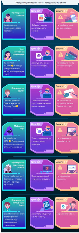 3. Мошенники. Определи цели мошенников и методы защиты от них. Задание не сложное, есть определенные подсказки.