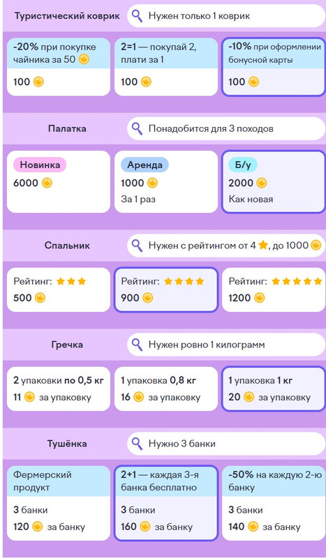8. Сборы и походы. Обязательно внимательно смотри условие, не покупай например новую палатку, если ее можно купить в б/у (как новая).
