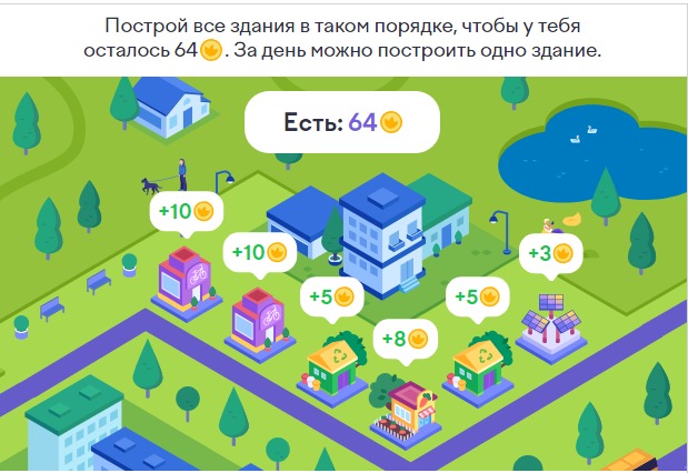 4. Экологический город. Построй все здания в таком порядке, чтобы у тебя осталось 64. За день можно построить одно здание.
