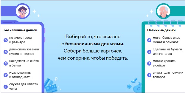 5. Виды денег. Здесь вам надо собрать больше (5 карточек), чем у соперника, то что относиться к безналичным деньгам.
