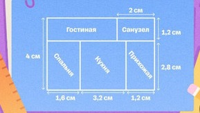 Гостиная: на чертеже 1,2 см на (1,6+3,2+1,2)−2=4 см.