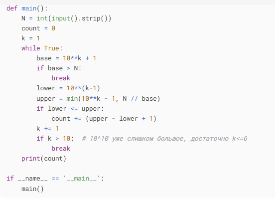 k=3: base=1001 > 1390? Нет, 1001<=1390, но upper=min(999, 1390//1001=1) -> lower=100, upper=1 -> нет (100>1).