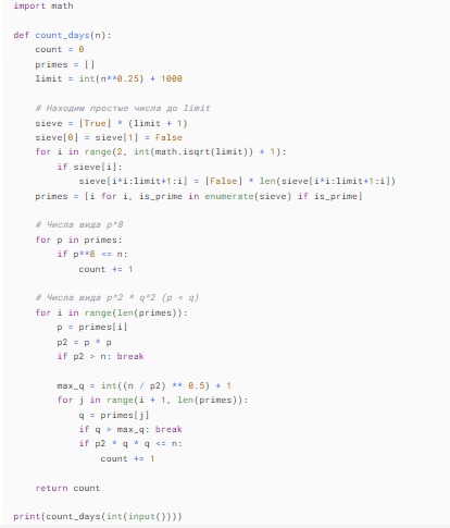 Недавно Филипп вышел на завод с необычным графиком работы. Смена Филиппа на заводе будет длиться n дней, при этом каждый из дней, у которого ровно 9 делителей, считается выходным. Посчитайте, сколько выходных будет у Филиппа за одну смену на заводе.