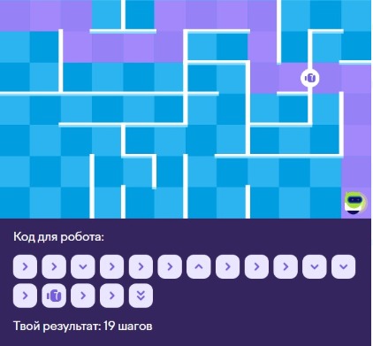 На первый взгляд, кажется, что задание проще простого. Но это не так. Так как например в первый раз проходя эту олимпиаду, именно в этом задании у нас было набрано 6 баллов. Хотя казалось, что путь был пройден самый короткий — 21 клетка. Но выяснилось (на второй раз), что это задание можно пройти более быстрее и затратив всего 19 клеток. Поэтому, перед тем как отправить ответ, внимательно посчитайте, может есть более короткий путь.