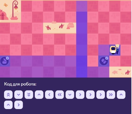 В этом задании нужно не только собрать мусор, который раскидан по разным частям клеточного поля, но его еще надо отнести в мусорные контейнеры, которые тоже находятся в разных местах. Поэтому надо пройти так, чтобы было задействовано меньше команд. Здесь надо по возможности применять команду (<< или >>) до упора. Например, чтобы дойти до огрызка яблока, вам надо пройти в другой конец клеточного поля, а это порядка 7 клеток. А яблоко например находится на 6 клетке. Тогда мы используем команду (<< или >>) до упора, потом еще одну команду — < или > до яблока и у вас получается всего 2 команды. Ну и конечно смотрите, где вы можете пройти одно расстояние и захватить сразу несколько предметов.