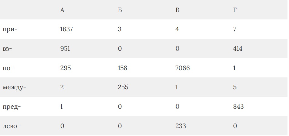 10. В таблице приведены данные о частотности в НКРЯ некоторых слов, которые начинаются цепочками букв из первого столбца таблицы, а заканчиваются цепочками букв, зашифрованными буквами A, Б, В и Г.