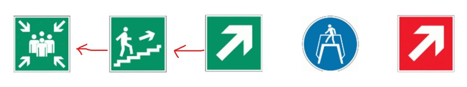 Сначала вы видите знак, который указывает направление (направо). Пройдя в этом направлении, вы увидите следующий знак, который указывает подняться вверх по лестнице. И уже там, в конечной точке, будет находиться сам знак «Пункт сбора».