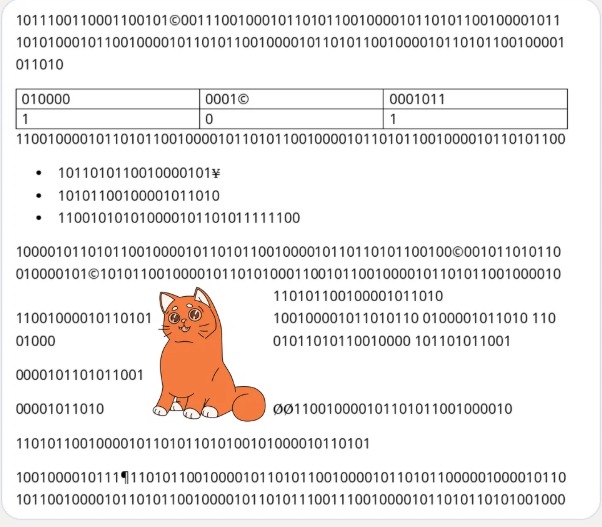 Это первый документ. В нём должен быть сплошной текст из нулей и единиц, но в него были вставлены лишние элементы. Определи, какие именно функции вставки текстового редактора были использованы.