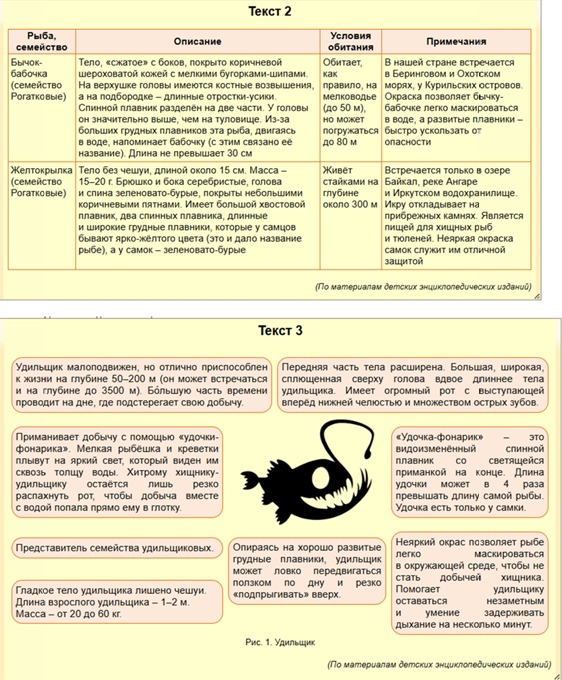 2. На основе информации из текста 1, текста 2 (таблицы) и текста 3 разместите таблички с названиями рыб под аквариумами.