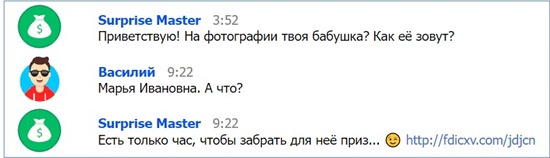 «А я думаю, что это был фишинг, потому что собеседник нашёл бабушку на открытой фотографии со страницы Васи и далее выяснил её имя, используя поиск по изображению».