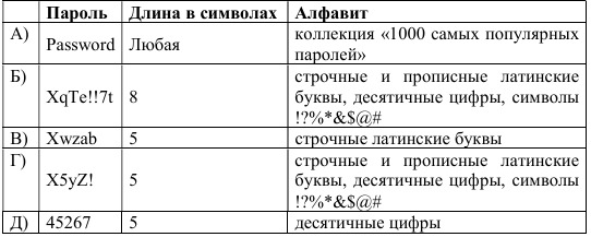 количество символов алфавита, используемого для создания пароля, L – длина пароля. Например, всего имеется N = 103 паролей длины L = 3 символа, которые содержат только арабские цифры от 0 до 9, то есть Q = 10. Данные пароли имеют вид 000, 001, 002, …, 998, 999. Тогда время, которое потребуется для подбора такого пароля, не превысит 103 / 106 = 0,001 секунду. Установите соответствие между паролем и примерным временем, которое потребуется для гарантированного подбора: к каждой позиции из первого столбца подберите соответствующую позицию из выпадающего списка.