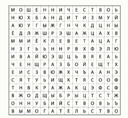 В представленной таблице нужно найти 10 зашифрованных преступлений из Уголовного кодекса РФ. Слово может быть зашифровано или по горизонтали, или по вертикали (сверху вниз). Слово не может быть найдено по диагонали. Ответы нужно