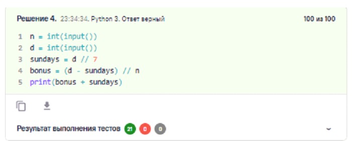 В кофейне «Сириус» постоянные посетители получают каждую nn-ю чашку кофе бесплатно. Кроме того, по воскресеньям в этом заведении также можно взять одну чашку кофе бесплатно (она не учитывается при накоплении бонуса). Тимофей, начиная с некоторого понедельника, в каждый из dd дней заходил в это кафе выпить одну чашку кофе. Сколько чашек он выпил бесплатно?