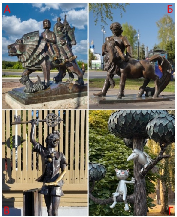13. Иногда памятники героям мультфильмов и сказок ставят по зову сердца. Например, «Сосиска дружбы», посвященная котенку по имени Гав в Новокузнецке. Достаточно часто герои связаны с городом или местностью, где установлен монумент. Алексей Толстой родился и прожил детские годы недалеко от Самары, Петр Ершов — рядом с Тобольском, Александр Волков работал в Томске, а в Воронеже действительно есть улица Лизюкова. Соотнесите памятники с картинок и города, в которых они расположены.