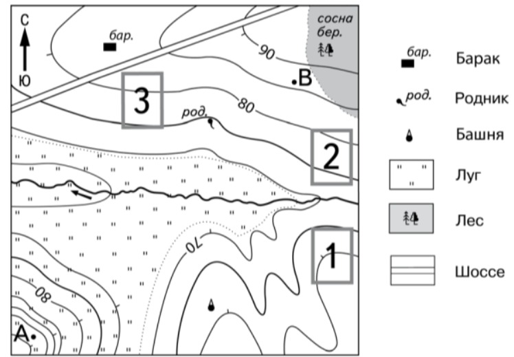 Задание 10. Определите по карте, в каком направлении от башни находится родник.