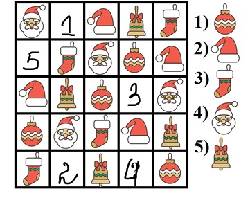 №10. Снежку нужно разложить картинки в пустые клетки так, чтобы изображения в каждом столбце и строке не повторялись. Какую картинку он должен поставить вместо вопросительного знака?