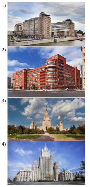8. На каких двух из представленных ниже иллюстраций изображены памятники архитектуры 1930-х гг., относящиеся к стилю конструктивизм? Запишите цифры, под которыми они представлены.