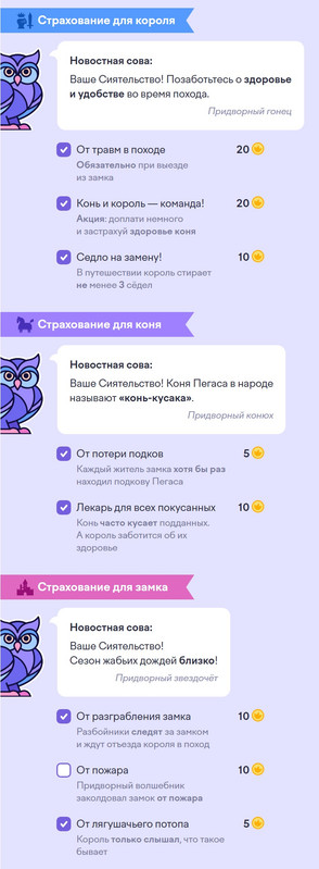 4 задание: Страховка для короля. Застрахуй короля, его коня и замок от возможных неприятностей во время похода. Обязательно прислушивайся к новостной сове. У короля есть 100 монет. Внимательно читай, о чем говорит сова. Именно по ее совету, делай свой выбор и тогда задание будет решено верно.