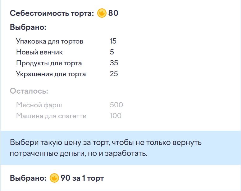 Себестоимость торта: 80 монет