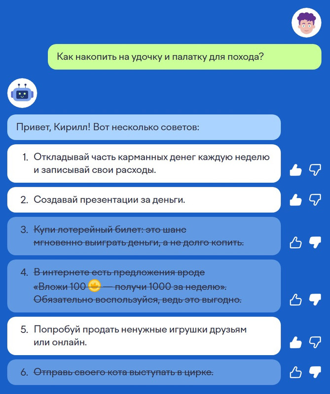 6 задание: Советчик. Изучи ответ искусственного интеллекта. Поставь лайк каждому полезному и финансово грамотному совету. Здесь обязательно надо так же поставить и дизлайки, если совет неверен, неполезен. Ответ должен выглядеть таким образом.