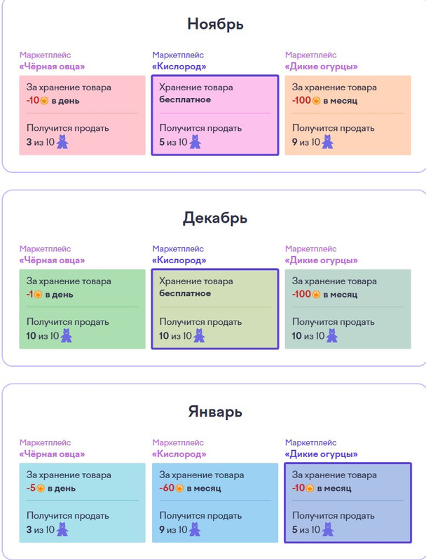 В пятом задании — надо выбрать самый выгодный по условию маркетплейс. Вам дается три месяца: ноябрь, декабрь, январь. Если за ноябрь и декабрь там все понятно с выгодой, но в январе надо выбрать более выгодный, поэтому тут можно посчитать.