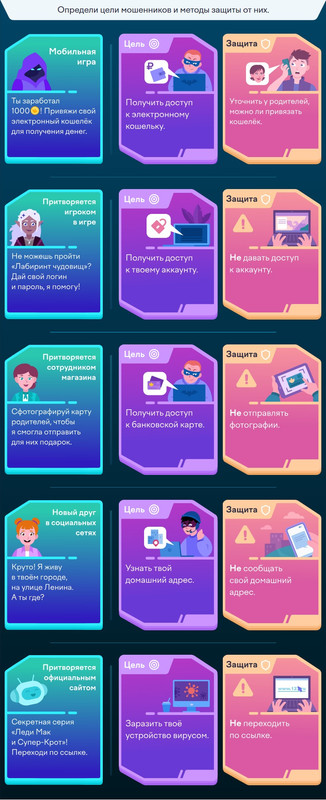 Ну а теперь давайте перейдем к самим заданиям. Первое задание у нас связанно с мошенниками и их действиями. Надо просто определить, найти нужную карточку, что хотят мошенники и как предотвратить их деяние. У нас получился такой ответ.
