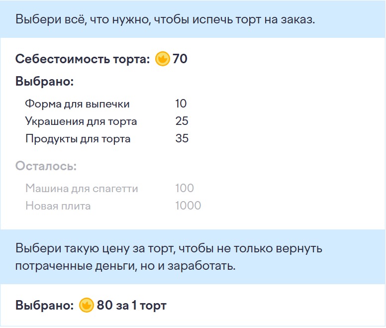 Переходим к седьмому заданию под названием — Кондитерская. Здесь просто выбираем те товары, которые необходимо для приготовления торта. Потом выбрать за какую цену торт можно продать, чтобы была выгода.