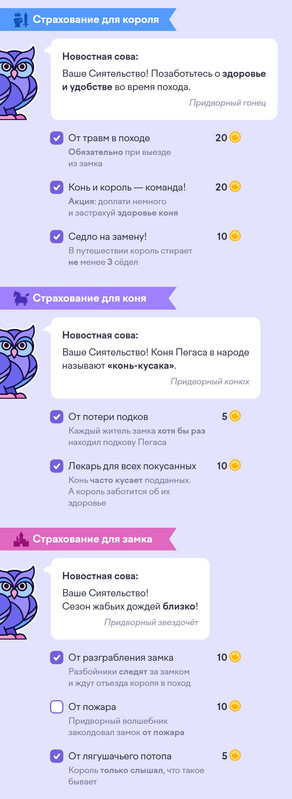 Застрахуй короля, его коня и замок от возможных неприятностей во время похода. Обязательно прислушивайся к новостной сове.